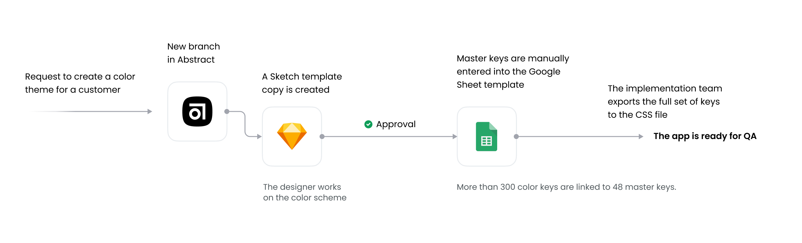 The old white-label design process relied on a Sketch + Abstract bundle. In the Sketch design system, each color style had a reference to a color key. To create a new color scheme for the custom app, a designer had to make a new branch of the design template in Abstract (the copy of a Sketch file in which it was possible to make changes that did not affect the main file). Upon approval of app color scheme by the client, designer had to manually transfer all the color keys HEX codes into Google spread sheet and pass that sheet to the implementation team.