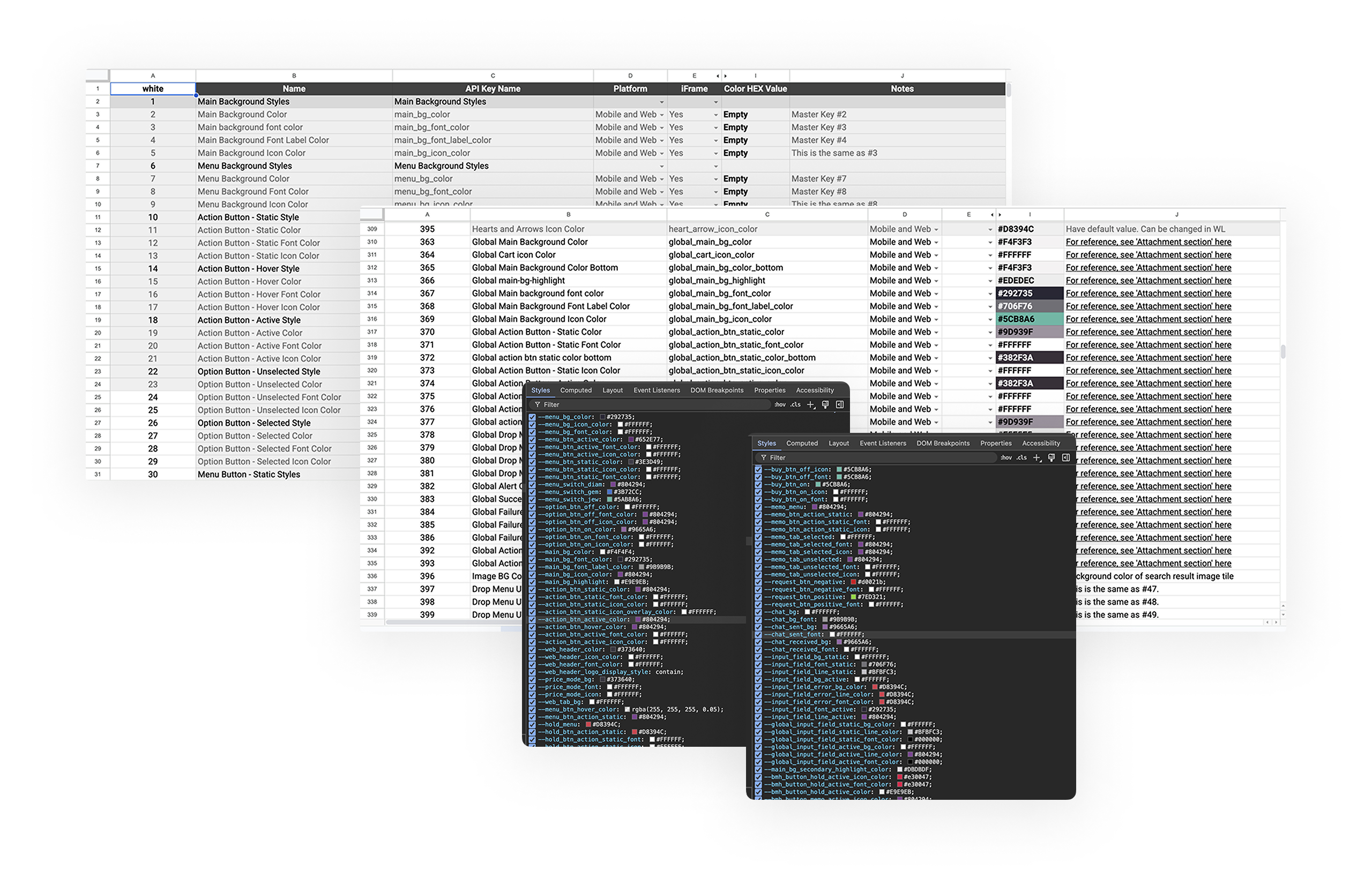 The process also lacked automation because the designers had to manually enter the HEX values of the main keys into Google Sheets. The implementation team also had to manually transfer these values to CSS tables. There was a huge potential for improvement in terms of automation.